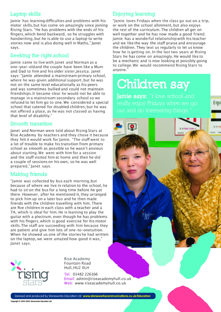 Jamie’s life has been transformed and he is now making excellent progress thanks to the targeted education offered by dedicated staff at Rising Stars.
